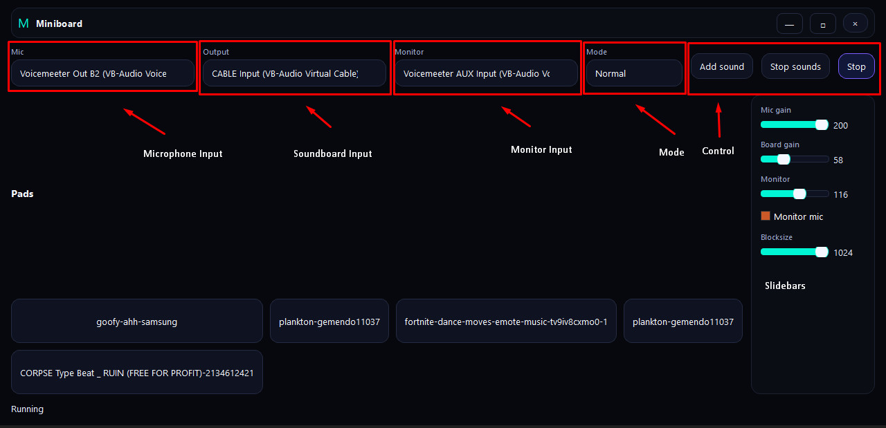Miniboard allows you to use custom sounds using the VB Audio cables without